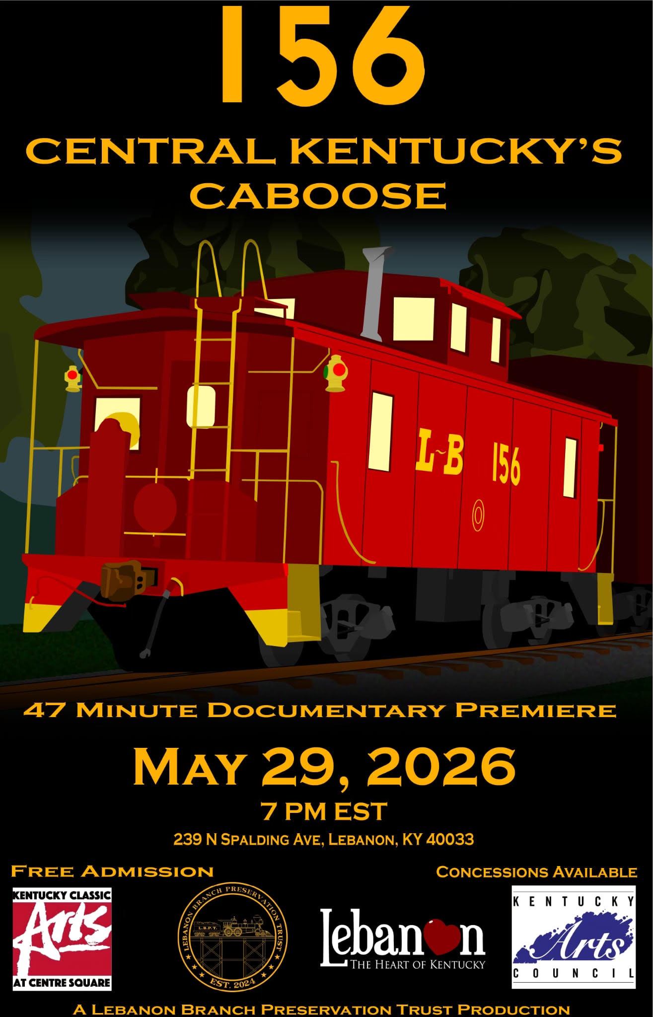 47 minute Documentary film about 156 – Central Kentucky’s Caboose made in Lebanon, Ky. by the Lebanon Branch Preservation Trust. Event is FREE to the public – come learn about the history and importance of trains running through Lebanon. School Grounds Coffee will be open for concessions and film makers will be here for information and talk back with interested historians. You can find this event on Facebook HERE