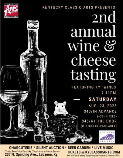 Join us on August 23rd for an elegant evening at the upcoming Wine and Cheese Tasting hosted in The Blackbox Club at Kentucky Classic ARTS at Centre Square .