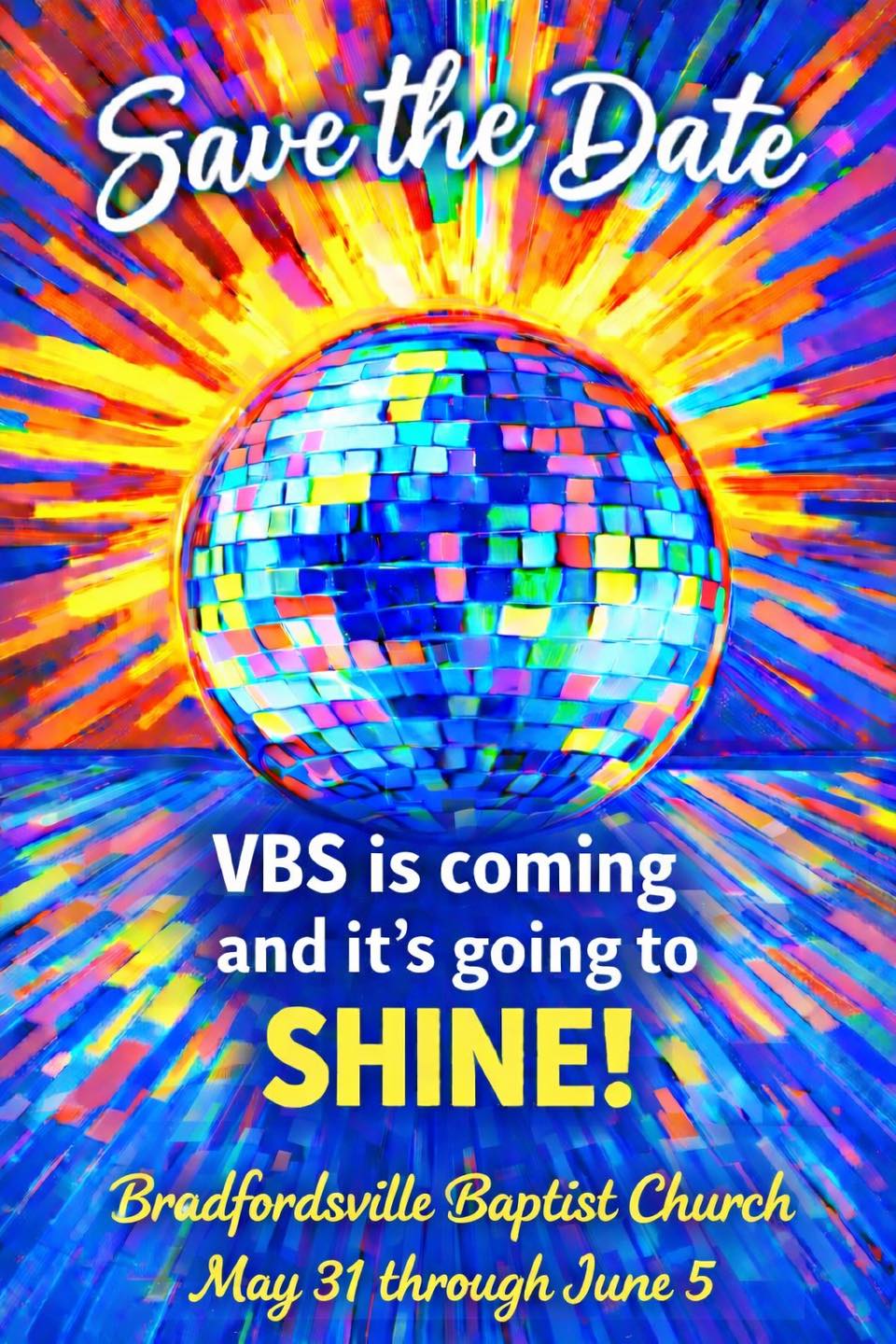 โœจ๐ŸŽ‰ SAVE THE DATE! VBS is coming and itโ€™s going to SHINE! ๐ŸŽ‰โœจ