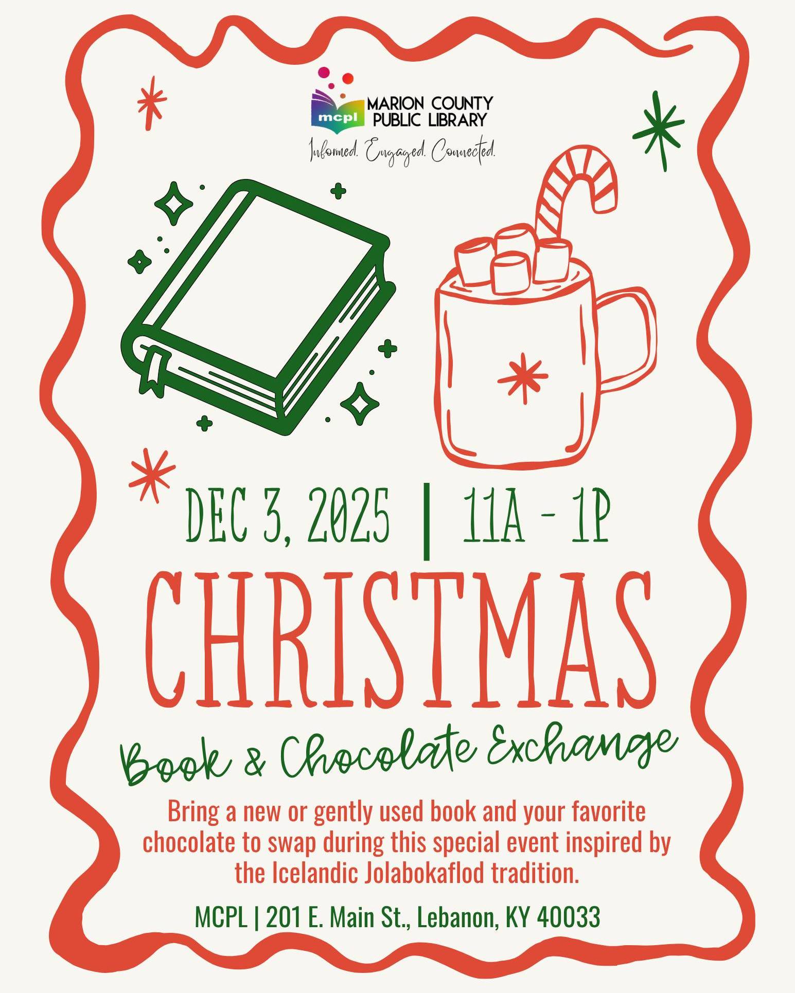 Join us on December 3rd from 11AM – 1PM for our third annual Book & Chocolate Exchange! Bring a new or gently used book to swap, and your favorite chocolate!