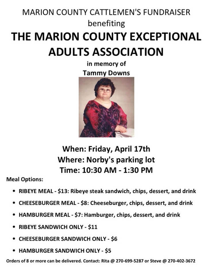 The Marion County Cattlemen will be partnering with The Marion County Exceptional Adults Association to host a Cattlemen’s Cookout Fundraiser this Friday April 17 at the Norby’s parking lot. Our sister, Tammy, loved the Cattlemen’s Association and all her friends at the former Handicapped Association, and we are holding this special cookout to honor her memory. Please come out and support this outstanding organization in our local community! All profits will be going to the Marion County Exceptional Adults Association.