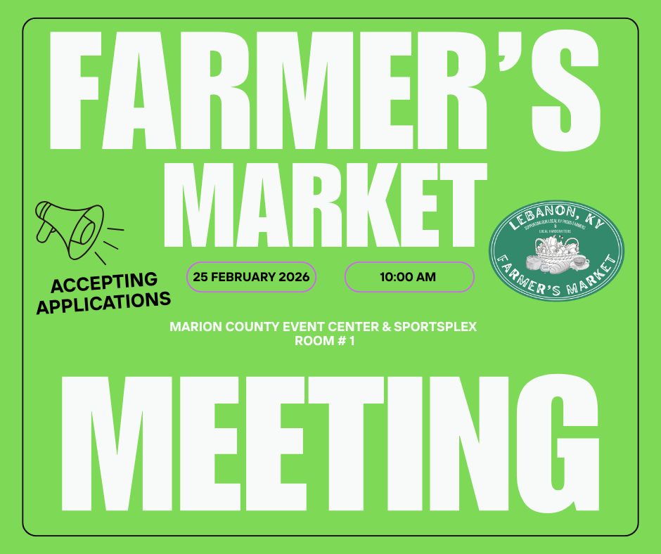 The Lebanon KY Farmer’s Market will hold its 2026 Vendor Application meeting on February 25, 2026, at the Marion County Event Center at 10 a.m. in Meeting Room # 1.