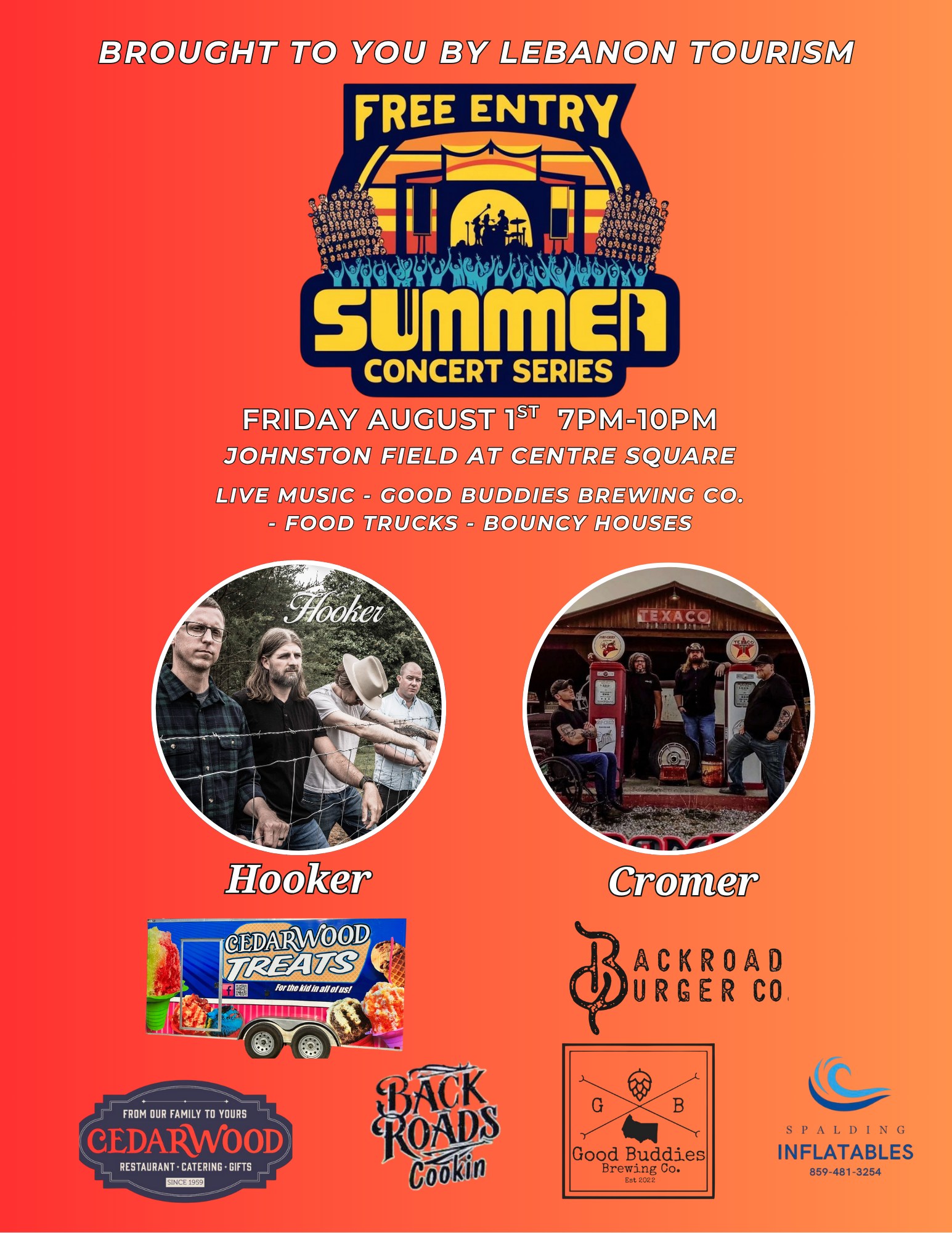 Join Lebanon Tourism for the final FREE ENTRY Summer Concert. This will be a MUST SEE concert as we plan on ending summer with a bang. Come out on Friday August 1 and rock out with Hooker and CROMER bands. As always we will have our buddies at Good Buddies Brewing Co. serving up some tasty local brews, some finger licking good food from Backroad Burger Co. Backroads Cookin’ Food truck, Cedarwood Restaurant •Catering •Concessions & Gifts, and of course Spalding Inflatables will have some bouncy houses set up for the kids. So grab a chair or a blanket, and bring the whole family out for a fun night as we say goodbye to summer. Rain will move inside.
