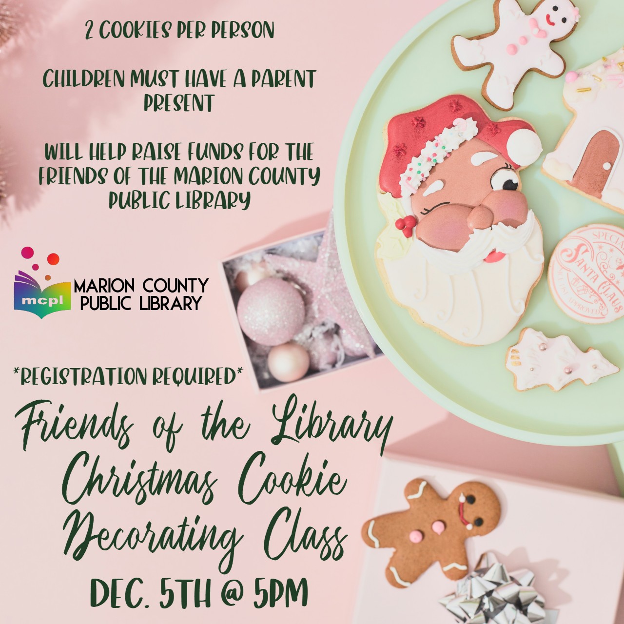 Register for this festive fundraiser on Dec. 5th at 5PM! We will be decorating Christmas cookies! Funds will go to pay for the cost of the event as well and fundraising for the Friends of the Library – Marion County KY!
