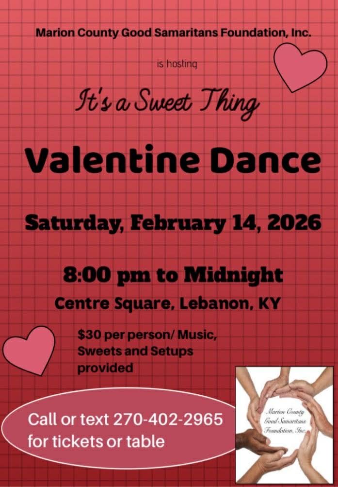 2/14/26 – Please save the date for our fundraiser/awareness Valentine Dance – It’s A Sweet Thing. Tickets are $30 and will go on sale Jan. 2. Feel free to text Bernadette at 270-402-2965 to reserve your tickets or a table of 8. All proceeds go to help Marion County residents battling cancer.