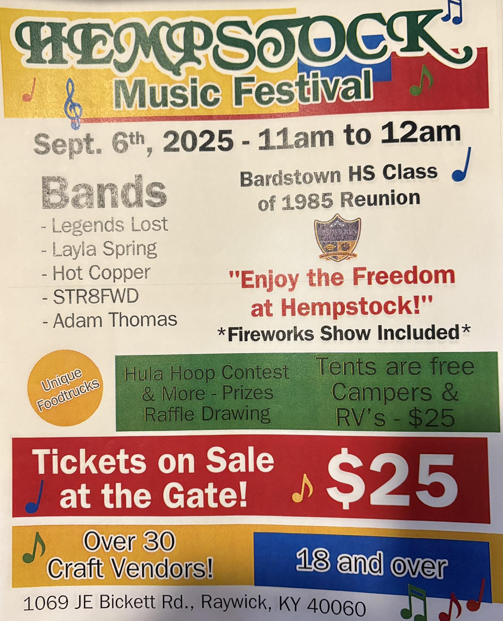 Come join in the down home, laidback vibe at Hempstock 2025! Featuring up and coming music artist, to newly found GEMS, on our one of a kind stage! Nestled in the hollers of Kentucky, and located on the Bickett family farm, in Raywick, KY. Enjoy a day of unique Foodtrucks, specializing in their mouth watering, one of a kind treats! You can also walk through the 35 original craft vendors, demonstrating their crafts, along with thousands of cool items they sell! Don’t miss a great day of fun, and the chance to make awesome memories!!! Plenty of room for campers and parking! 18 and older, as this is a day of adult themed fun! Hippies, bikers, farmers, hemp enthusiast, followers of the Original Cornbread Mafia, friends, locals, out of towners , and family all welcome! Bring your festival loving dogs! Hempstock 2025 will be held as a one day event on September 6th, 2025. Located on 1069 JE Bickett Rd. Raywick, KY. 40060.