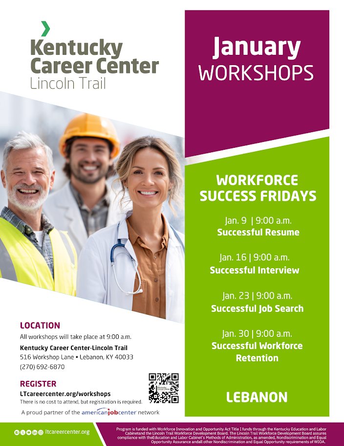 The workshops are part of Workforce Success Fridays, held throughout the month of January at the Kentucky Career Center Lincoln Trail, located at 516 Workshop Lane in Lebanon. These sessions are designed to help individuals improve their job readiness, explore career options, and gain tools needed to succeed in today’s workforce.