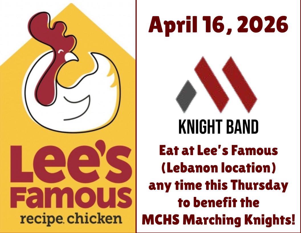 Like chicken? Want to support the band? If you answered yes, then I have the perfect opportunity for you. It’s simple, just come on down to Lee’s Famous Recipe in Lebanon this Thursday, get you some delicious chicken, and a proceed of the sales help out the Marion Band! Tell your friends and family!