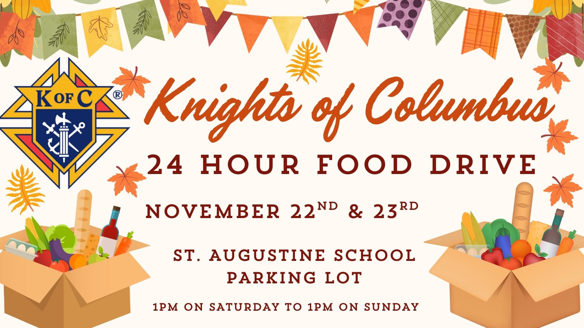 Accepting non-perishable food items, coats, gloves, and winter hats. Location: St. Augustine School parking lot.