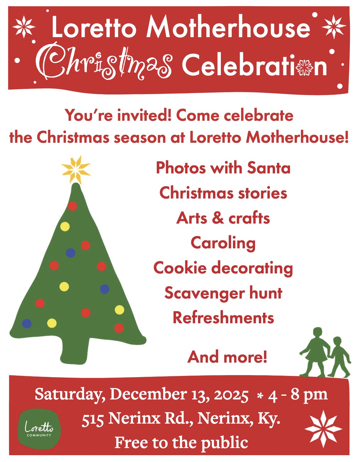 Celebrate the Christmas season with the Loretto Motherhouse! We’ll enjoy photos with Santa (4-7 pm), live music, a Christmas village with a working train, special displays of winter artifacts and art in the museum, door prizes for adults and children, a winter-themed Lego village, over 50 nativity sets from around the world, food, cookie decorating and more! Free and fun for all ages!
