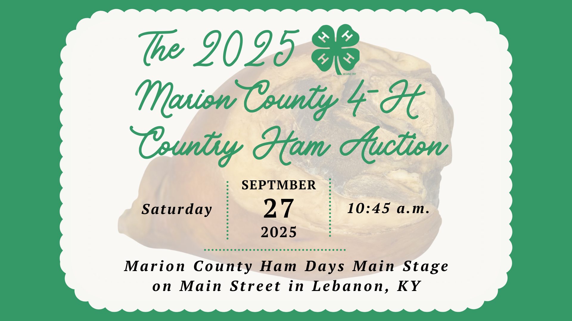 It is our hope you will attend the auction and will consider purchasing a ham in support of Marion County 4-H and its 4-H members. Checks must be written to the “Marion County 4-H Livestock Club” and can be considered as a tax-deductible donation for any amount over the base value of the ham.