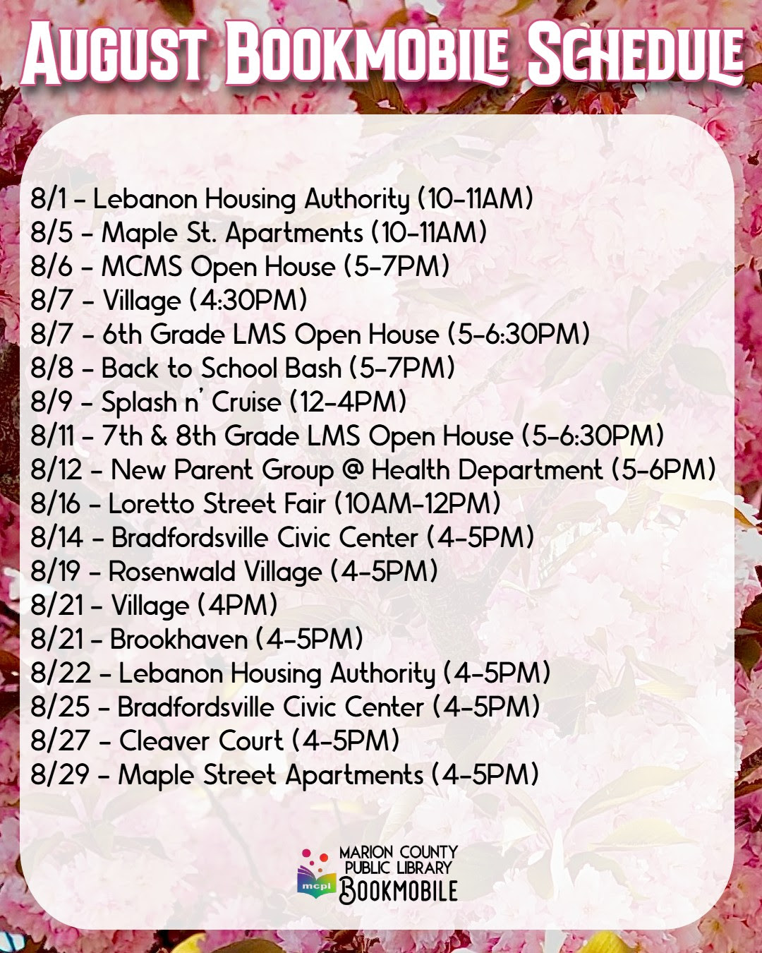 Marion County Public Library Bookmobile August Schedule