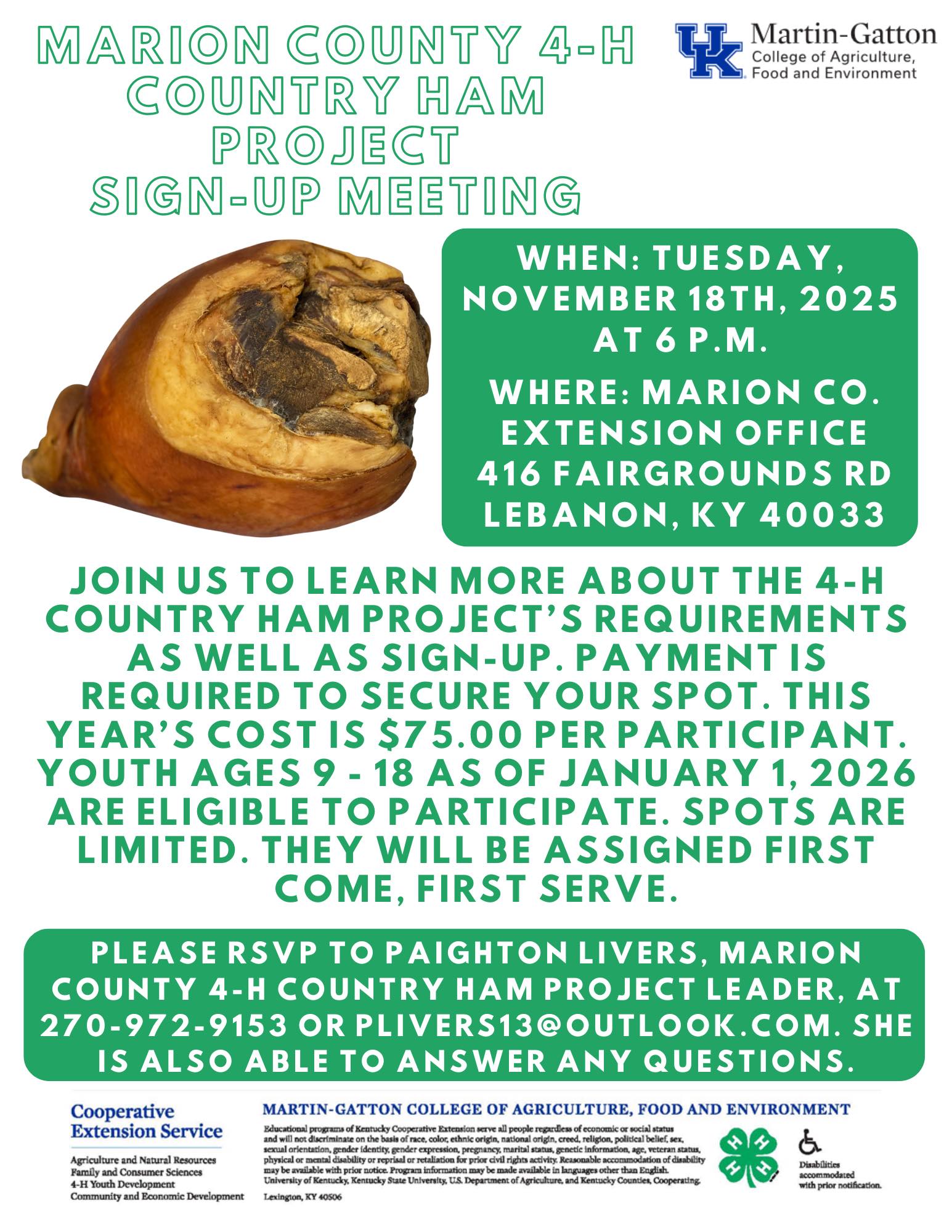 If your child wants to participate in the Marion County 4-H Country Ham Project, please attend the sign up meeting with your child on Tuesday, November 18 at 6 p.m. You can follow the extension office on Facebook HERE