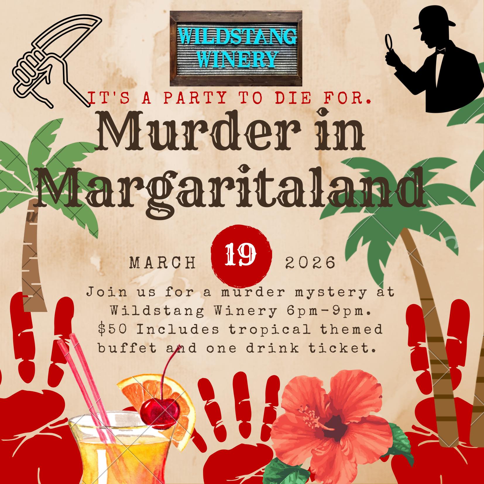 Join us for Murder at Margaritaland, an evening full of murder, mystery and betrayal. Use your skills and gather the clues to solve the murder, all while enjoying a tropical themed getaway filled with tropical food and drinks!