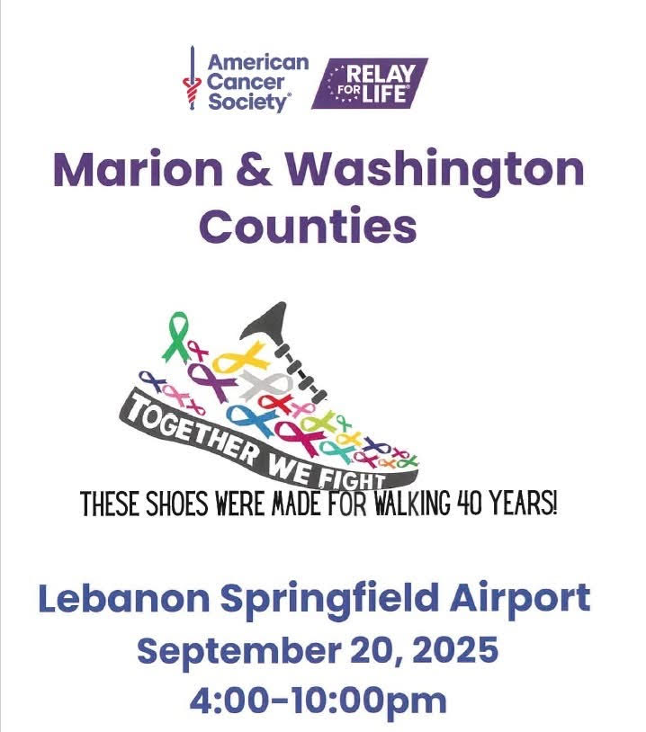 The 2025 Relay For Life will be on September 20, 2025. This event will be held at the Lebanon-Springfield Airport. Anyone wanting to join the committee or form a team may contact the group on Facebook at https://www.facebook.com/share/g/15ZWSuSDWM/