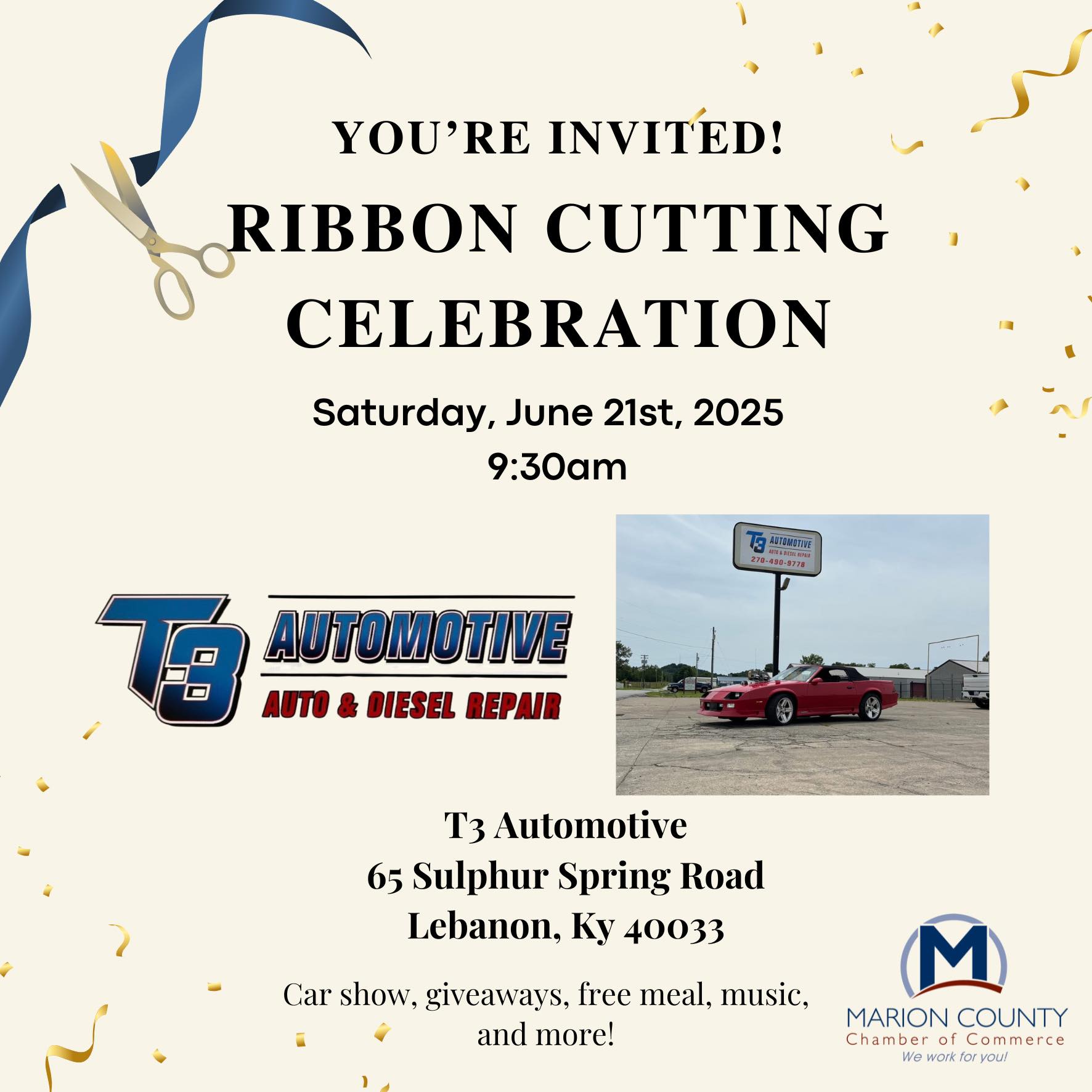 Join the Marion County Chamber of Commerce on Saturday, June 21 at 9:30 a.m. for the Ribbon Cutting & Grand Opening of T3 Automotive, Marion County’s newest auto service shop for gas and diesel vehicles. The shop is located at 65 Sulphur Spring Road, Lebanon Ky 40033. Following the ribbon cutting there will be a car show, giveaways, free meal, music and lots of fun. Come welcome this new business to the community.