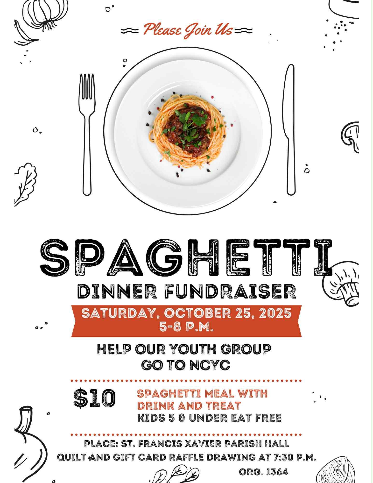 🍝 Before you and your family enjoy Halloween in the Park, stop in next door at the St. Francis Xavier Parish Hall for a delicious spaghetti dinner! Raffle chances for the quilt (it’s beautiful) and the gift card basket will also be sold. Drawing for the two raffles will be held at 7:30 p.m. that night. All proceeds will help our youth group attend NCYC (National Catholic Youth Conference in Indianapolis) in November.