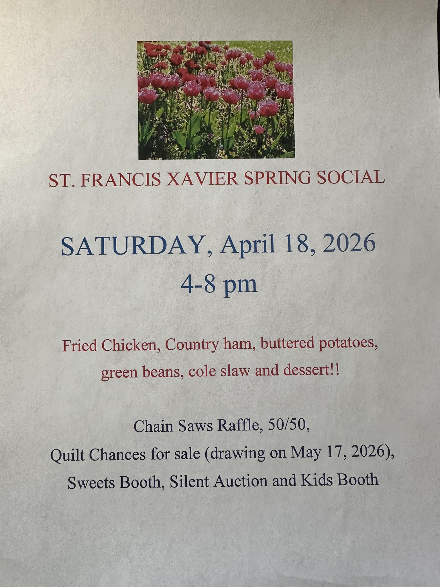 Get ready folks! Our Spring Social is on the way. We will be having our famous chicken and country ham supper, raffle off two (yes two) Stihl chain saws, a 50/50 raffle, sell chances for the Sew-Cialize Club’s UK quilt (given away on May 17), a sweets booth, kids booth, and a silent auction. You can follow the church for this and other events on Facebook HERE