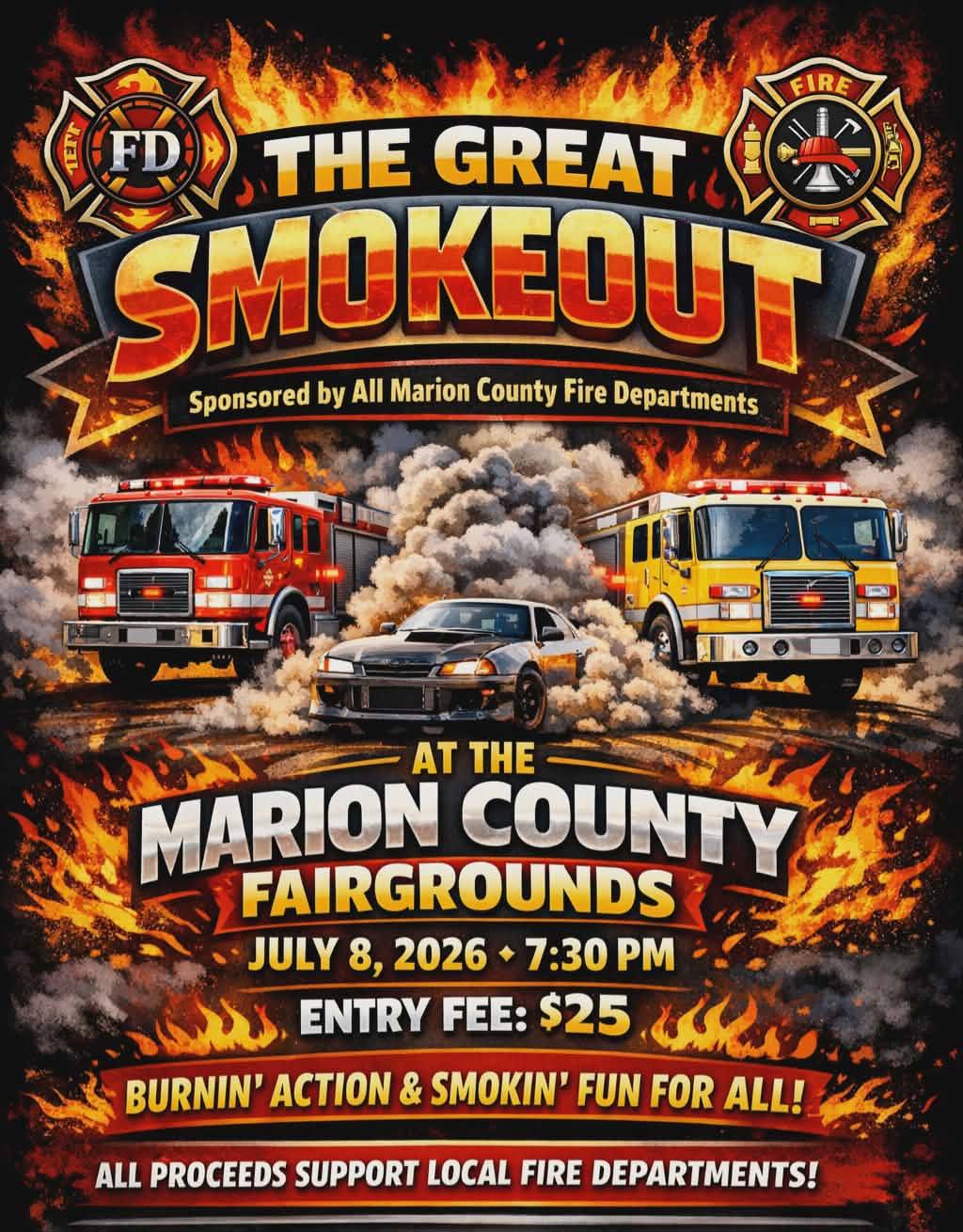 This will be a event that raises money for all fire departments within Marion County: Lebanon Fire & Rescue, Loretto Fire Deptartment 393, Raywick Fire Department, Bradfordsville Fire Department, & Gravel Switch Fire Department. Cars, trucks, motorcycles & anything with wheels that want to “Smoke-out” are welcome. All proceeds of this event will be split amongst Marion County Departments. 1st and 2nd place trophies will be sponsored by a fire department in each category.