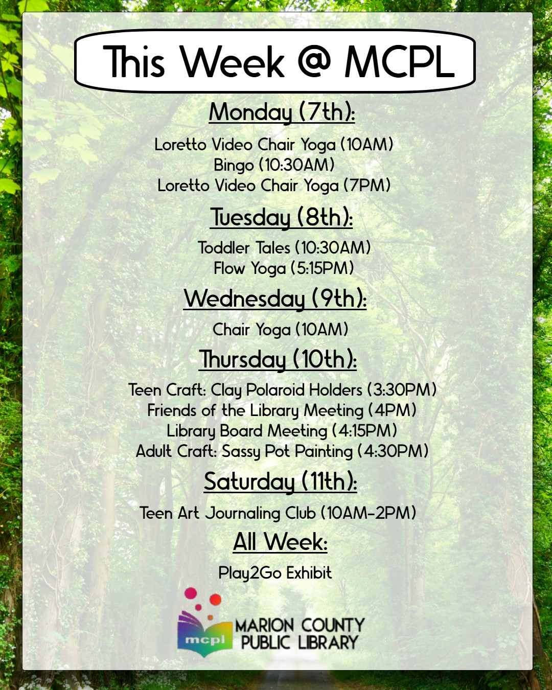 Here is a look at this week at MCPL! Here is a look at this week at MCPL! Be sure to swing by and check out the Kentucky Science Centers Play 2 Go interactive exhibit for the kiddos! As always if you can’t make it in to the library, check our Bookmobile Schedule and see when the library is coming to you. To sign up for bookmobile services check out the signup, also linked below.