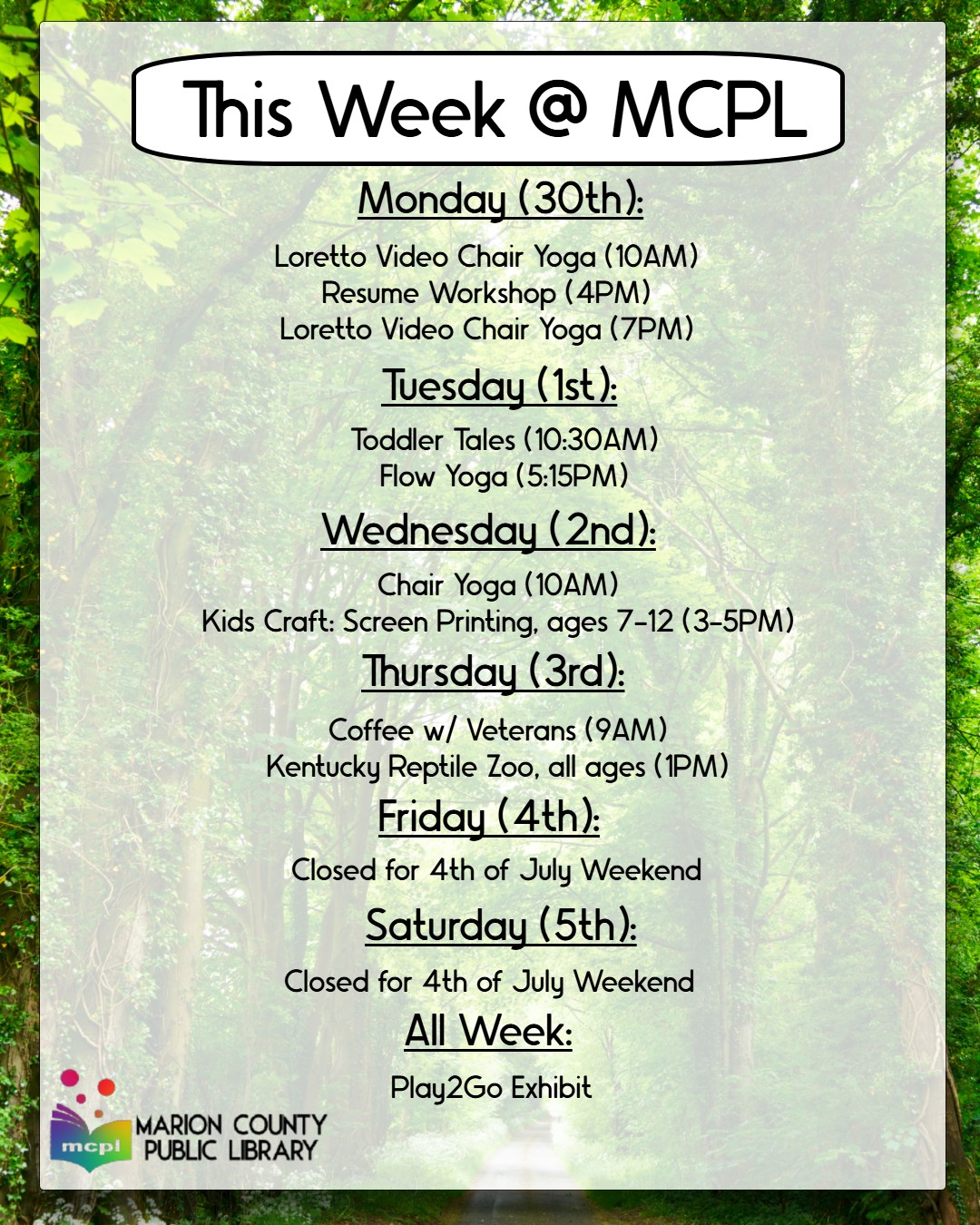 Remember some events do require pre registration and don’t forget there is now a Loretto branch of the Marion County Public Library located at 255 School Drive in Loretto, KY. Hours are Monday, Wednesday and Thursday from 10 a.m. till 5:30 p.m. and every 4th Friday from 10 a.m. till 2 p.m.