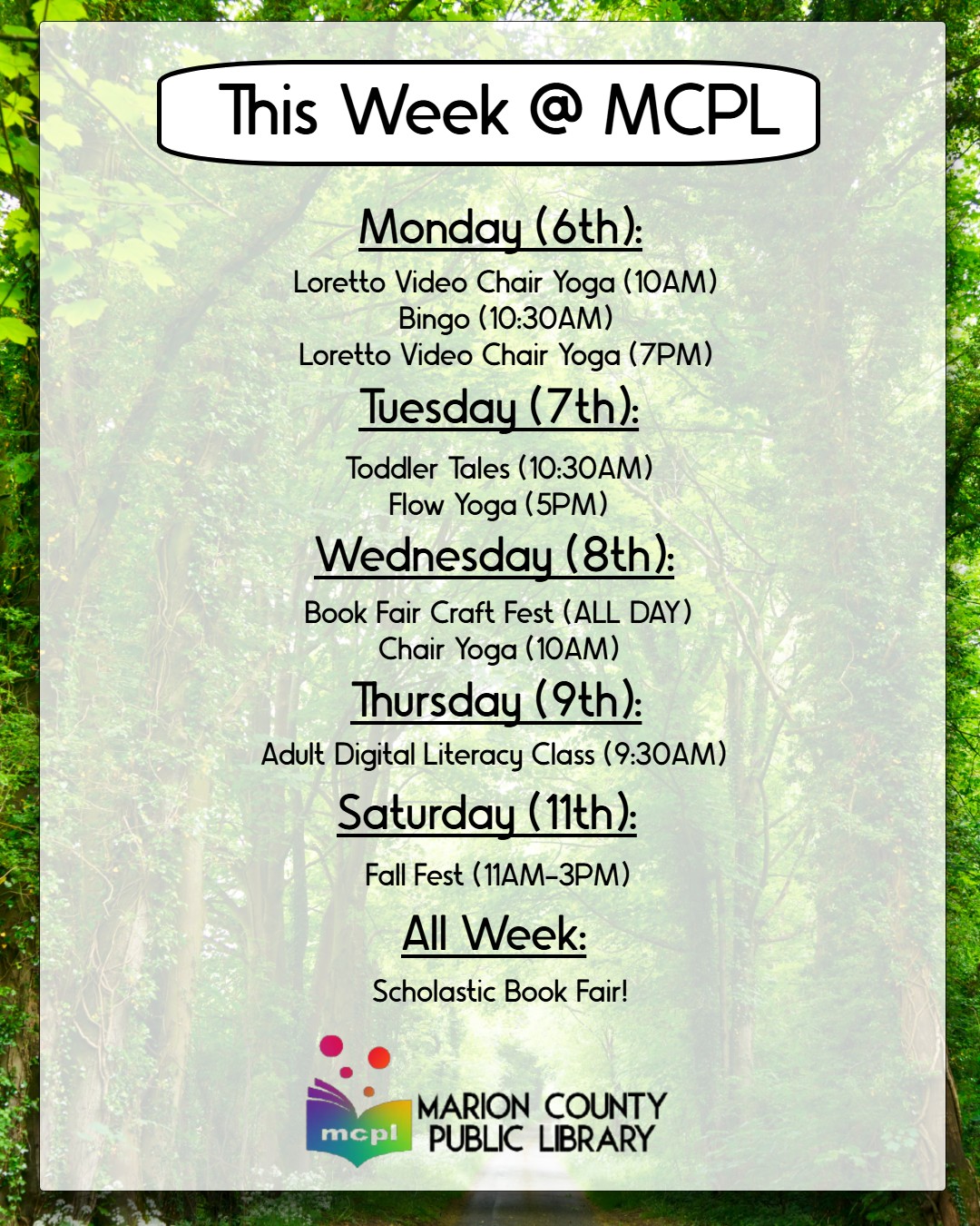 For complete details on things happening at the library, follow us on Facebook at https://www.facebook.com/MarionCoPublicLibrary or sign up for the emailed newsletter by going to our website: www.marioncopublic.org and find the opt-in form on the right side of the screen, enter your email address, then look forward to weekly news to be delivered to your inbox.