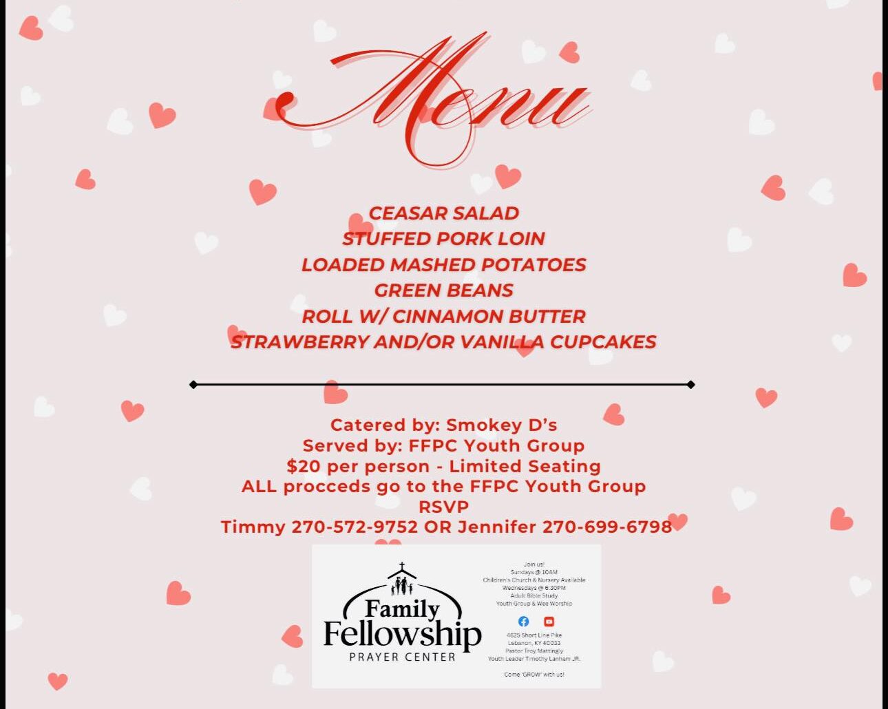 Family Fellowship Prayer Center Youth Group will be hosting a “Valentine’s Dinner” on February 28, 2026.